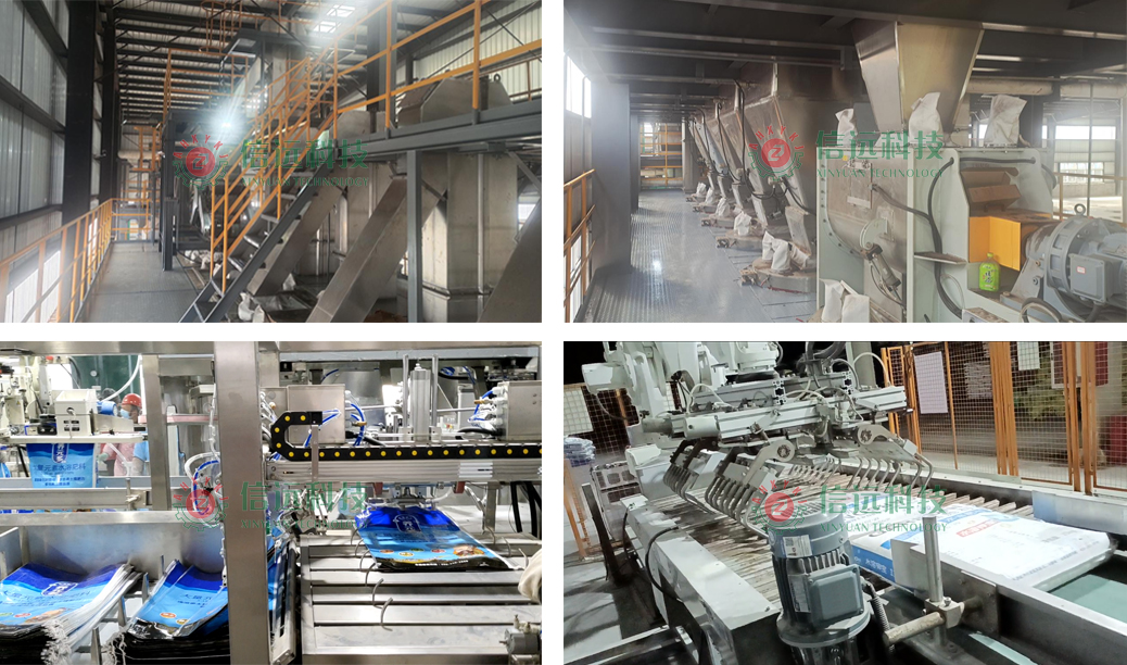 信遠科技為廣大肥料行業客戶推薦的這套年產2-5萬噸的固體粉劑水溶肥設備配置方案,適用于充填容量為5-50kg的編織袋、PP/PE袋,可以包裝大量元素水溶肥、中量元素水溶肥、微量元素水溶肥、含氨基酸水溶肥、含腐植酸水溶肥、含黃腐酸鉀水溶肥等不同配方的固體粉劑水溶肥產品。該套方案從前端的配料工段到后端的碼垛工段均采用了全自動化的設備系統,在批量化的流水線作業中,提高了生產效率,穩定了產品質量,降低了生產成本,縮短了生產周期,保證了生產的均衡性和產品的標準化。