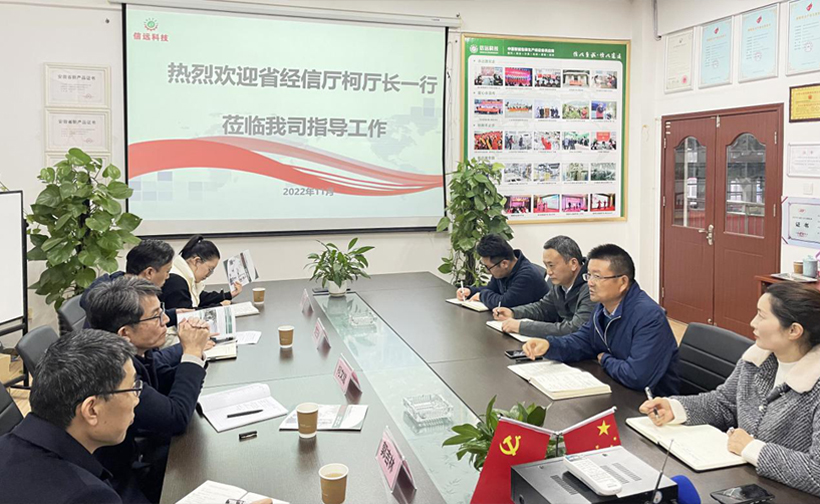 11月22日,安徽省經信廳黨組成員、副廳長柯文斌,省經信廳工業互聯網處副處長劉三新, 合肥市經信局工業互聯網處處長郭吉林,省經信廳工業互聯網四級主任科員汪沁紫一行來到安徽信遠包裝科技有限公司進行專題調研。信遠科技董事長倪合青及公司相關領導熱情接待了柯廳長一行。