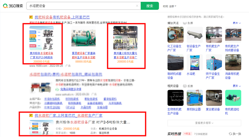 (以上為360搜索“水溶肥設備”,阿里巴巴在首頁主推的多個展現信息都是信遠科技)