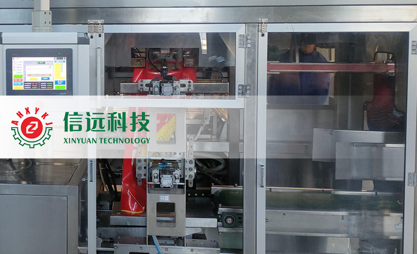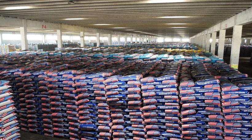 這套生產線設備是原料經過人工投料后,配混設備會把不同配方的物料元素按照不同的配置比例進行自動配料和自動混合。混合均勻后的原料輸送至包裝機上方的儲料倉斗內,倉斗內的物料通過快慢兩級螺旋給料的方式充填進包裝袋中,包裝過程為全自動化作業,無需人工參與,即可完成自動上袋、夾袋和充填物料,待稱重傳感器檢測到袋內物料重量達到設定數值時,自動停止充填、并自動松袋落袋,落在輸送帶上的包裝袋將會自動運送至自動折邊縫包機前進行縫包成品。成品袋在輸送過程中,自動完成倒包、振實、壓平等理包整形后,由機器人完成碼垛入庫,日產量可以達到100噸左右。