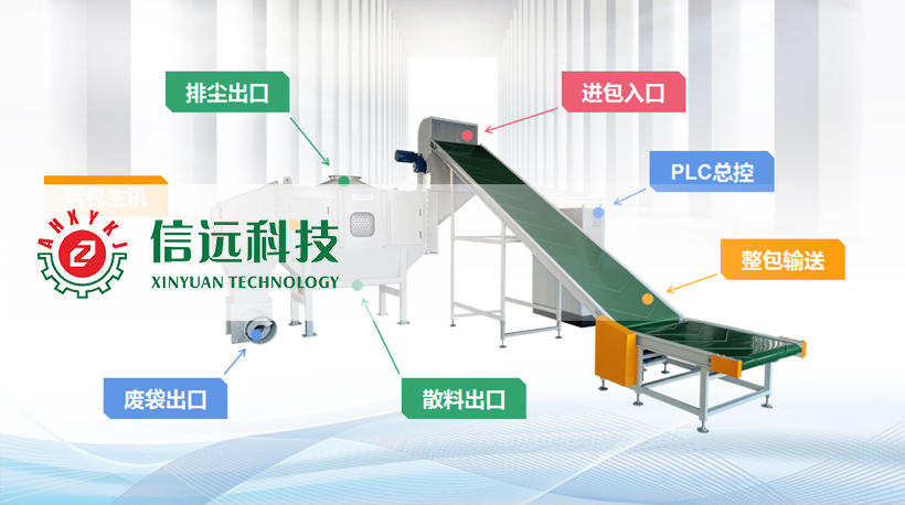 信遠科技新一代全自動破包機,采用PLC智能微機控制,交互界面操作簡易,自動化程度高。生產企業把需要拆破的袋裝物料通過運送裝置進入破包機主機箱,切刀會快速將包裝袋切開并成條狀。切開后,物料與包裝袋隨即進入滾筒篩分裝置內,滾筒通過轉動將物料和包裝袋分離,物料自動落入箱體下方的料斗,滾筒內過濾出來的條狀包裝袋,通過廢袋收集機構完成自動收集。袋、料分離產生的揚塵通過滾筒箱體上方的除塵裝置排出。該機特別適用于干燥的、粉塵大的粉狀物料的破包卸料,具有無粉塵外泄、無需人工參與、生產效率高、篩分效果好、原料浪費低、安全省心省力等綜合優勢。