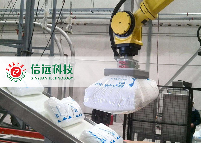 信遠科技新一代全自動破包機,支持前端配套連接拆垛機器人進行無人化作業。拆垛機器人通過模仿人手和手臂的動作功能,按照設置的程序來抓取搬運待拆的包裝袋,可以對不同袋裝堆垛進行拆垛工作,處理速度快。拆垛機器人和自動破包機組合而成的全自動拆垛破包一體化生產設備,將幫助用戶在安全場景下,實現更加快速的生產作業。