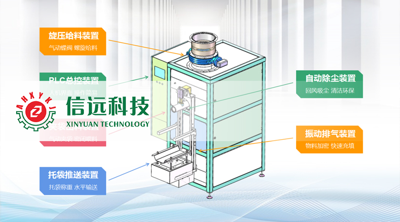 信遠(yuǎn)科技新一代閥口袋包裝機(jī),采用PLC智能微機(jī)控制,交互界面操作簡易,自動(dòng)化程度高。人工只需套袋和啟動(dòng)按鈕,喂料系統(tǒng)、稱重系統(tǒng)、夾袋系統(tǒng)、排氣回氣系統(tǒng)、密封系統(tǒng)和電氣控制系統(tǒng)均為自動(dòng)化運(yùn)行。旋壓式給料技術(shù)和電子稱量系統(tǒng),保證了包裝速度和包裝精度。電氣元器件全部采用防塵密封式設(shè)計(jì),保障了設(shè)備性能穩(wěn)定可靠、經(jīng)久耐用。該機(jī)配置有振動(dòng)排氣機(jī)構(gòu)及氣流輔助輸送單元,在充填過程中可對袋內(nèi)物料進(jìn)行振實(shí)加密,同時(shí)進(jìn)行同步排氣吸塵,有效解決了超細(xì)粉料在包裝中存在漂浮揚(yáng)塵、不易充填等技術(shù)難題。