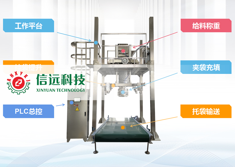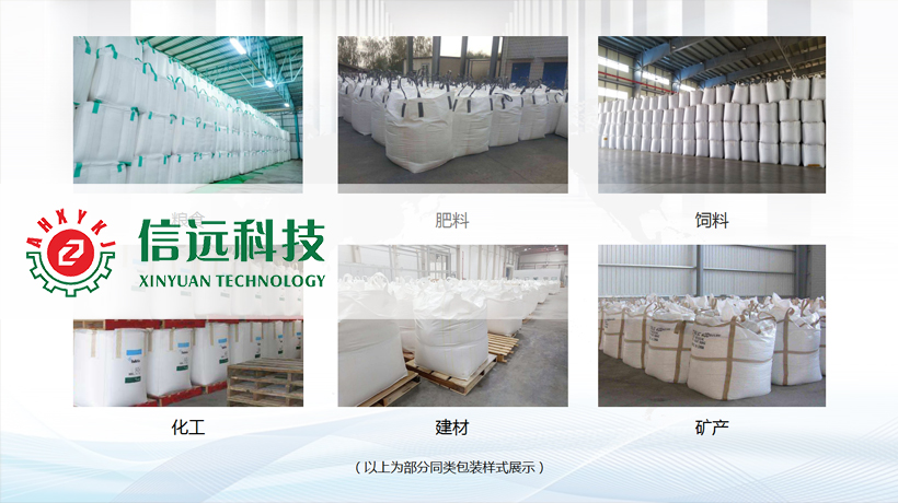 信遠科技全自動噸袋包裝機組,廣泛應用于電力、煤炭、石化、化工、化肥、糧食、飼料、冶金、環保、建材、塑料、橡膠、染料、新材料等行業大型軟袋顆粒物料或粉狀物料的自動定量包裝。