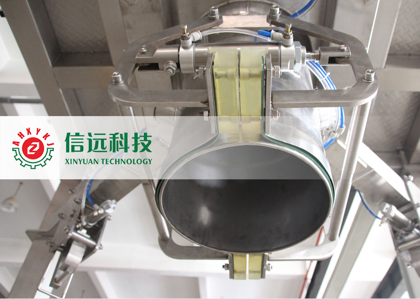 該工段采用升降式結構設計。在物料充填前,人工在下料口套袋,并把包裝袋吊帶掛在四個掛耳上,按下啟動按鈕,下料口夾袋氣缸開始工作并夾住袋口,升降氣缸將包裝袋提升,風機吹氣脹袋,控制系統通過參數設定將袋皮重量自動去除,驅動喂料機構運轉,物料自動下落,下料過程中,自動排氣除塵,同時可以開啟自動敦袋功能(敦袋次數可任意設定),達到設定重量停止下料,包裝袋自動降落到下面的輸送機上,夾袋氣缸松開袋口,吊帶自動脫鉤,輸送機自動啟動把包裝袋運送至下一工序。