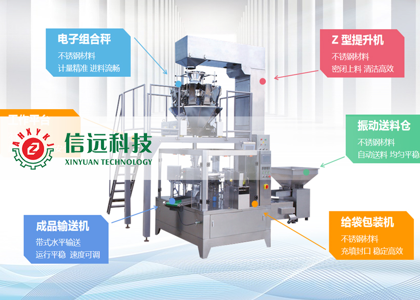 信遠科技顆粒料全自動旋轉式給袋包裝機組,是由密閉Z型提升機、電子計量組合秤、多工位旋轉式給袋包裝機和成品輸送機組成。可以包裝單袋克重在30-5000g范圍之間的顆粒狀物料,生產企業可以根據自己的需求選擇不同的包裝機型號。這套機組設備適合各種顆粒狀、片狀、條狀、圓狀、塊狀及不規則形狀等物料的定量包裝,具有自動完成送料、計量、給袋、充填、封口、打印、計數、輸送等一系列功能,是食品、化工、農資等行業提高包裝生產效率,打造綠色環保車間,提升包裝檔次的新型自動化裝備。