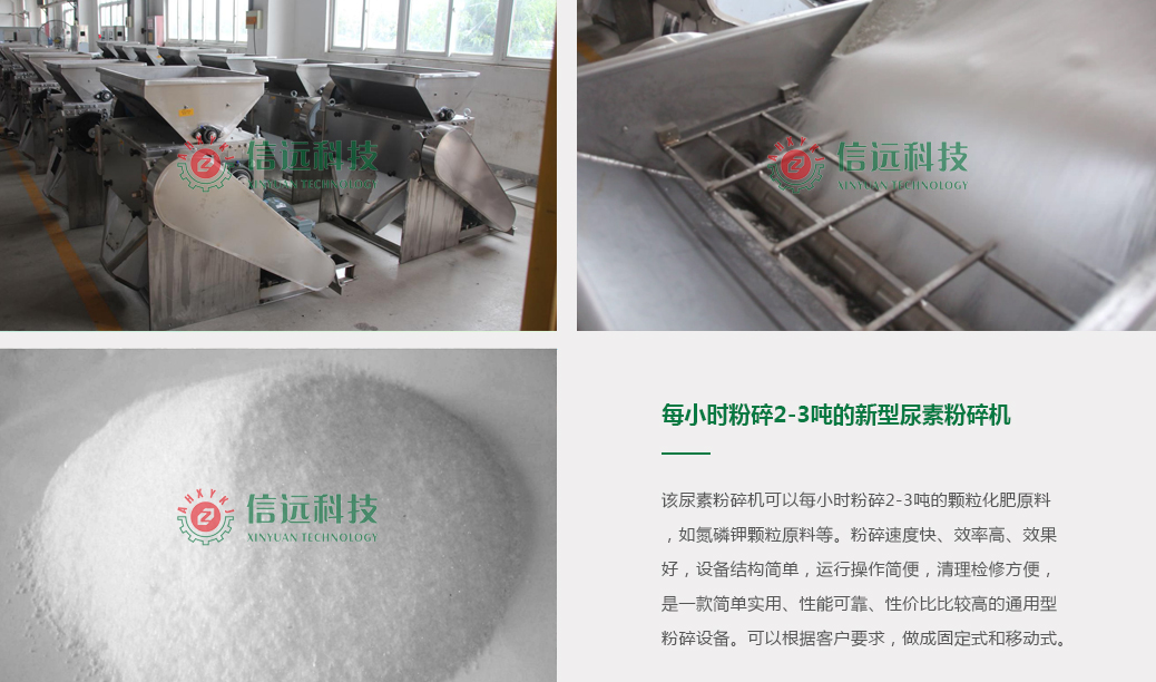 安徽信遠包裝科技有限公司SG600S型對輥式尿素粉碎機,是一款專門針對顆粒化肥原料進行粉碎的新型專用生產設備。該尿素粉碎機可以每小時粉碎2-3噸的顆粒化肥原料,如氮磷鉀顆粒原料等。粉碎速度快、效率高、效果好,設備結構簡單,運行操作簡便,清理檢修方便,是一款簡單實用、性能可靠、性價比比較高的通用型粉碎設備。可以根據客戶要求,做成固定式和移動式。