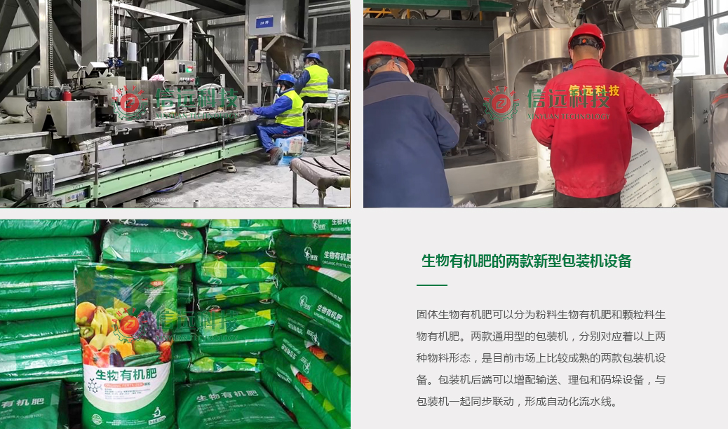今天我們來認識一下固體生物有機肥新型包裝機設備,固體生物有機肥可以分為粉料生物有機肥和顆粒料生物有機肥,這兩種物料形態(tài)的包裝設備是不一樣的。國內(nèi)知名的肥料設備制造商安徽信遠包裝科技有限公司,在這里為廣大肥料生產(chǎn)企業(yè)推薦兩款通用型的包裝機,分別對應著以上兩種物料形態(tài),是目前市場上比較成熟的兩款包裝機設備。包裝機后端可以增配輸送、理包和碼垛設備,與包裝機一起同步聯(lián)動,形成自動化流水線。