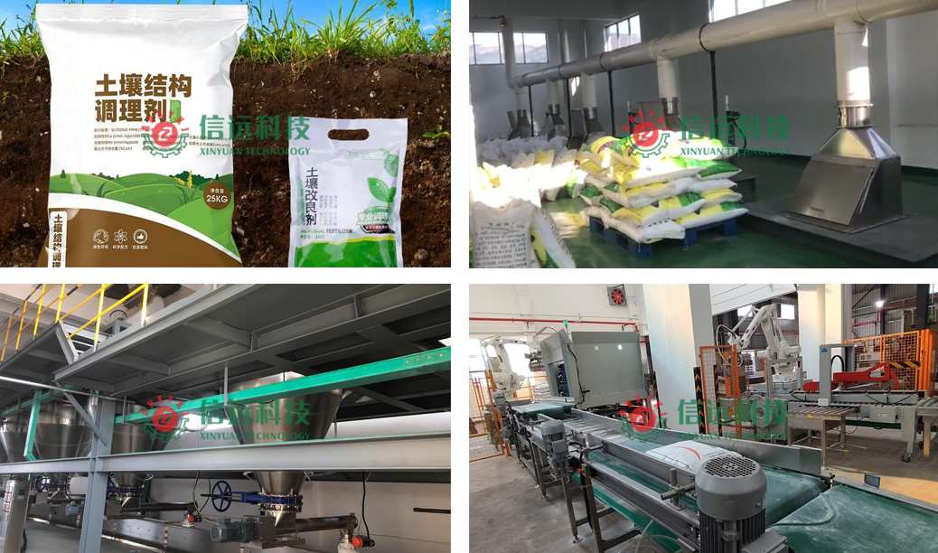 信遠科技土壤調理劑成套生產設備,主要由原料預處理、配料混合、計量包裝、裝箱打包、理包碼垛五大裝置工段組成。首先,配方原料按照技術標準進行預處理加工后,進入自動配料和自動混合工段;配混均勻后的原料自動卸料至包裝機上方的緩存料倉,通過供料裝置,進入自動計量包裝工段。計量包裝系統由小袋包裝系統和重袋包裝系統組成,可以自動完成小袋到重袋產品的自動給袋、計量、包裝、封口、噴碼、裝箱、理包等一系列生產動作,然后由機器人完成抓取堆垛,成品運輸入庫。