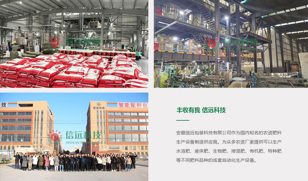 安徽信遠包裝科技有限公司作為國內知名的農資肥料生產設備制造供應商,長期服務于中化、中農、云天化、金正大、六國、云圖、新洋豐、史丹利、施可豐、鄂中、開門子、興發、華強、開磷、三寧、祥云、輝隆等國內肥料龍頭企業,為眾多農資廠家提供可以生產水溶肥、液體肥、生物肥、摻混肥、有機肥、特種肥等不同肥料品種的成套自動化生產設備,是中國農資廠家“穩生產、強供應”背后的堅定合作伙伴。信遠科技將一如既往地和中國農資生產企業一起,共同為中國農業大豐收保駕護航,為中國農業現代化添磚加瓦。