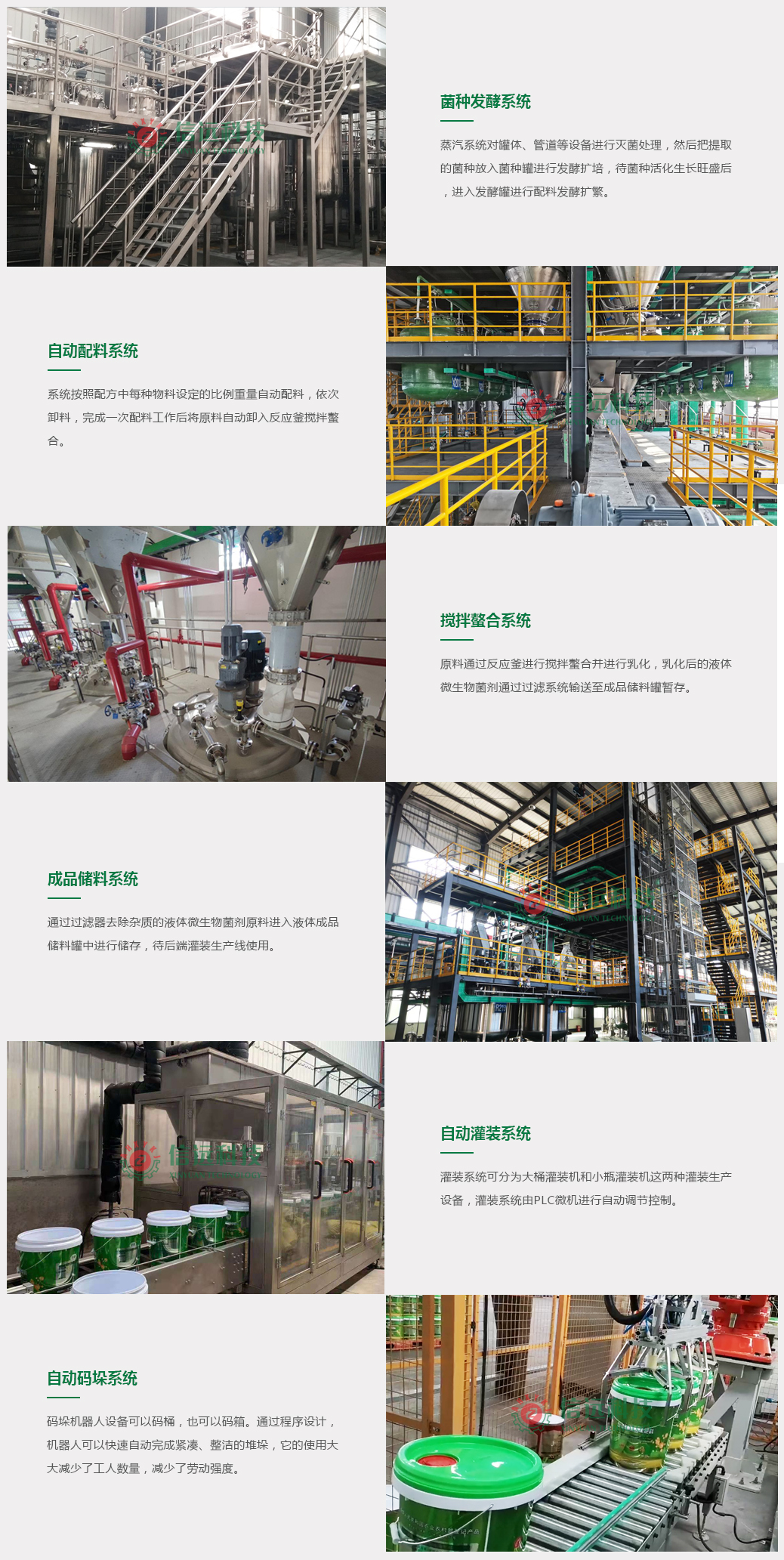 液體微生物菌劑全自動成套特肥設備,包含了設備滅菌、菌種發酵、配料發酵、擴繁培養、滅菌消泡、成品儲液、計量灌裝、上蓋封口和輸送碼垛等前后端全流程的生產裝置,是生產放線菌、固氮菌、硅酸鹽菌、枯草芽孢桿菌、木霉菌、酵母菌、光合細菌等不同種類微生物菌劑的理想設備。
