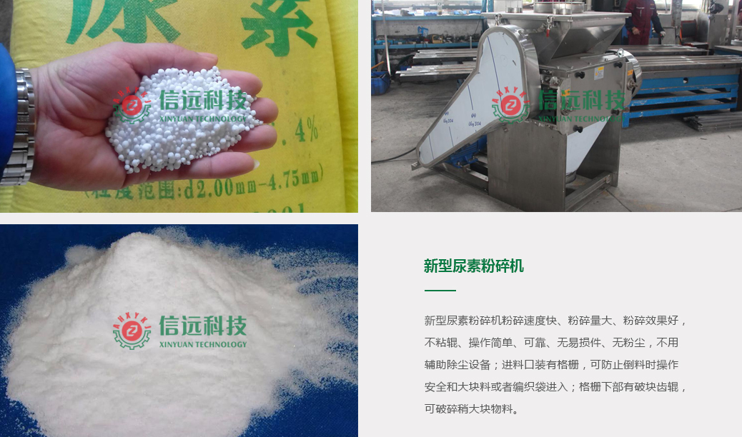 該尿素粉碎機粉碎速度快、粉碎量大、粉碎效果好,不粘輥、操作簡單、可靠、無易損件、無粉塵,不用輔助除塵設備;進料口裝有格柵,可防止倒料時操作安全和大塊料或者編織袋進入;格柵下部有破塊齒輥,可破碎稍大塊物料。即使有少量結塊也不會堵塞,連續工作;設有斜出料口(也可根據客戶需求設垂直出料口),出料口為圓弧角,不存料,無死角,出料口焊接一圈圓鋼,方便捆扎;整機材質為304不銹鋼制作,美觀大氣,防腐性能好。