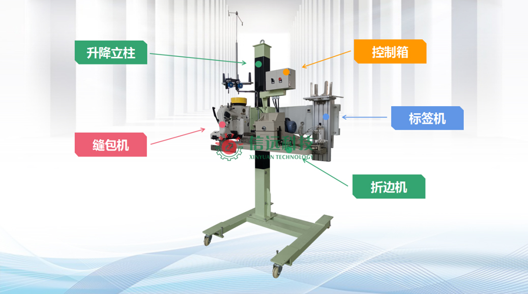 信遠科技折邊縫包標簽一體機組,由折邊機、標簽機、縫包機、控制箱、升降立柱組成,可以在折邊機和皮帶輸送機的配合下完成全自動運行。代替人工自動完成送袋、導袋、折邊、送標簽、縫合、剪線等工藝過程。適用于20-50kg不同規格編織袋、PE袋的自動折邊縫包。整機由光電開關控制啟停工作,設計精致美觀,操作簡單,機器高度可隨包裝袋大小進行調節,速度可根據生產線速度任意調節,輕松實現高效率生產和節省人工的目的。