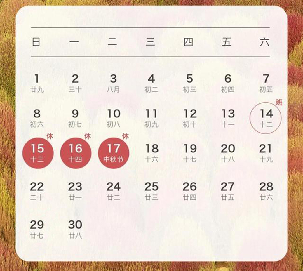 根據《國務院辦公廳關于2024年部分節假日安排的通知》精神,結合公司實際情況,現將2024年中秋節放假安排通知如下:9月15日(星期日)—9月17日(星期二)放假,共三天。9月14日(星期六)正常上班。
