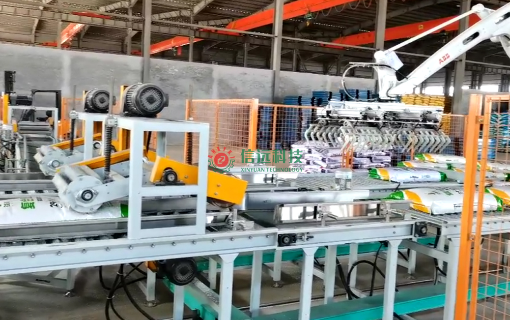安徽信遠包裝科技有限公司設計制造的全自動包裝碼垛生產線設備,是一套重袋包裝碼垛系統,由上袋機、包裝機、縫包機、噴碼機、輸送理包系統、碼垛機器人和軌道托盤庫等裝置組成,可以自動完成取袋、上袋、開袋、套袋、夾袋和計量充填,袋內重量達到設定值時,自動停止充填并松袋落袋,抱袋裝置自動推送至縫包機前,完成包裝袋封口。成品袋在輸送過程中,自動完成倒包、振實、壓平等理包整形后,機器人進行抓取碼垛,叉車搬運入庫。