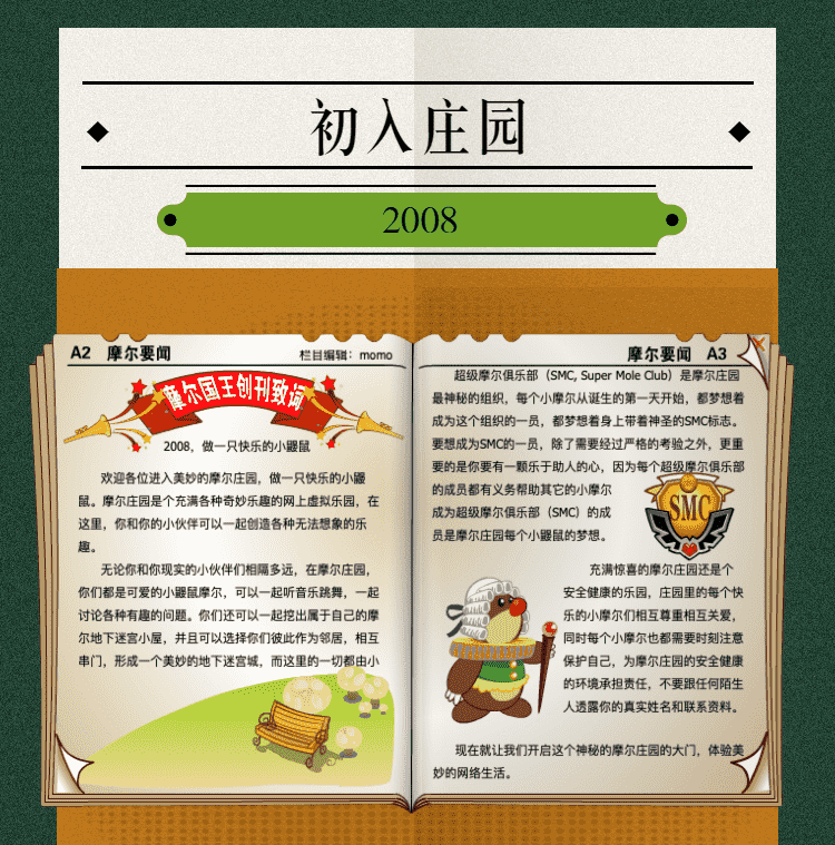 在这一年,,,,摩尔庄园诞生了。。。。在这里,,,,大家都是可爱的红鼻子鼹鼠小摩尔,,,可以一起勤劳耕作,,,,一起高山滑雪......我们都是摩尔庄园的建设者。。。。